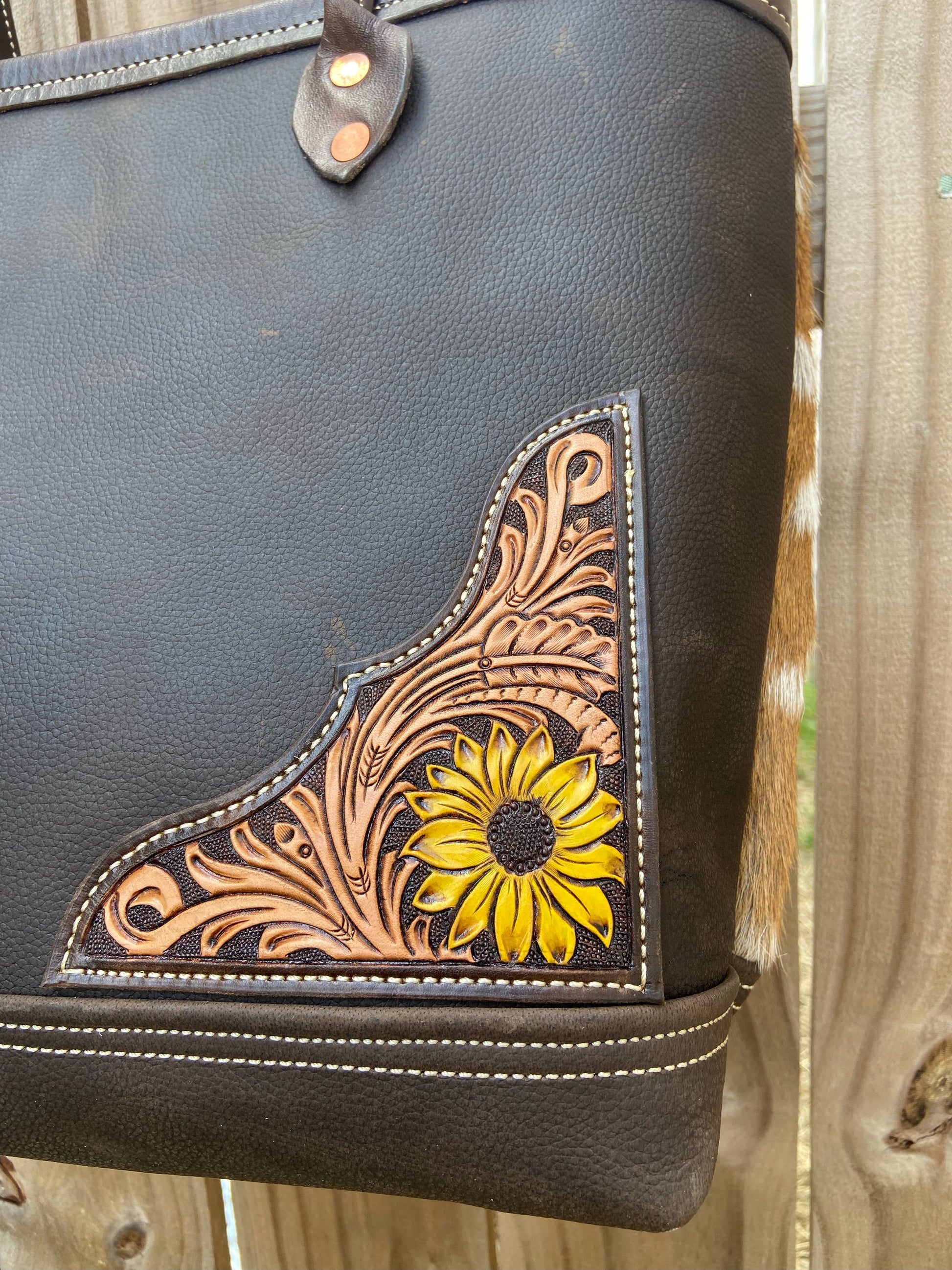 Flashy and functional, the Pebble Grain Axis Tote is a larger version of our Expedition Tote with the addition of exotic hair on Axis Hide! On the backside of this luxury bag is our much loved Pebble Grain oil tan Leather which backs two beautifully tooled corner piece designs of which you can personalize as desired!