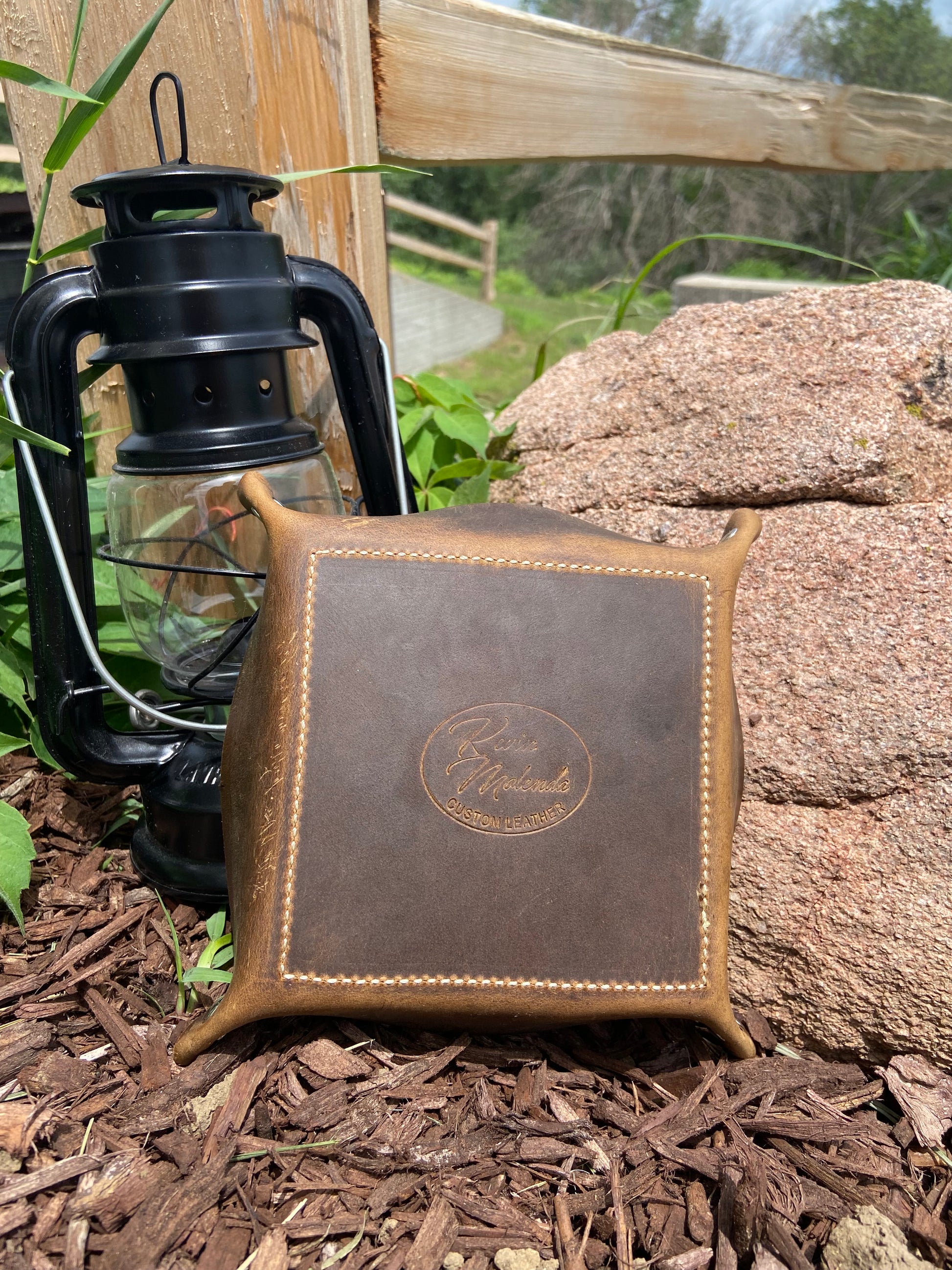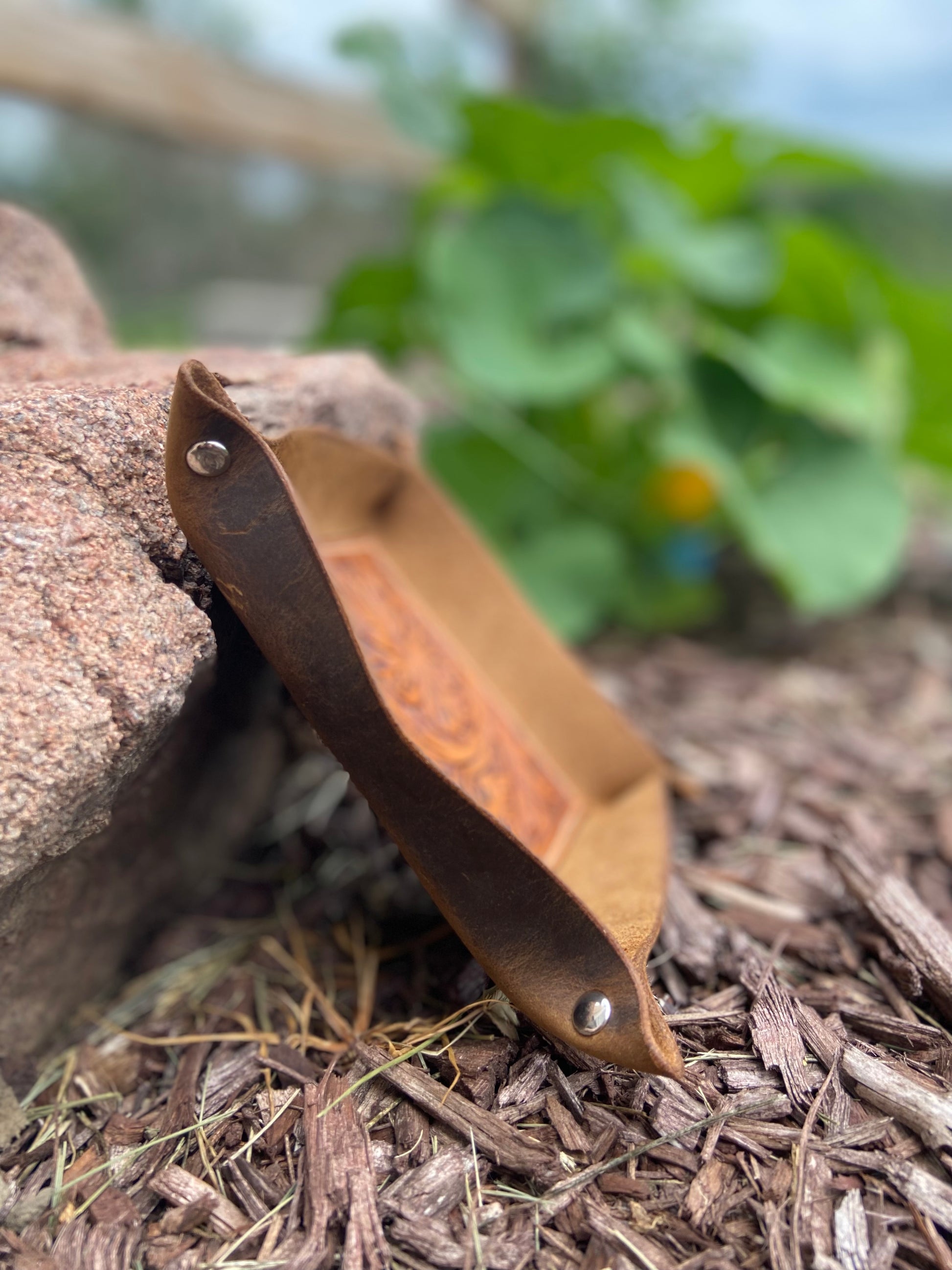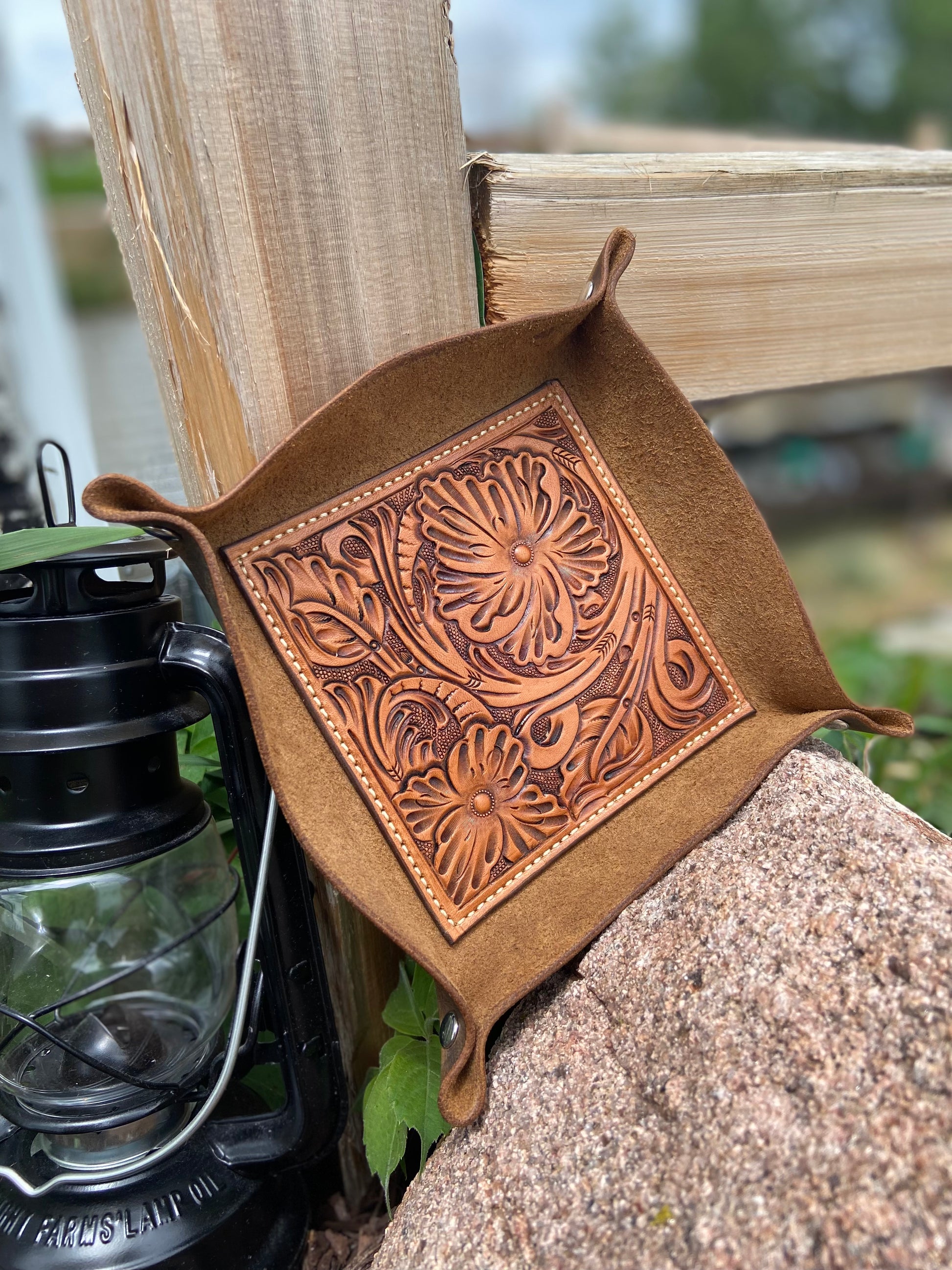 Put your daily essentials in this beautiful 100% Leather hand tooled Valet Tray! It makes the perfect gift for any occasion, and can be customized with personal initials and brands! They tray base measures 5”x5”.